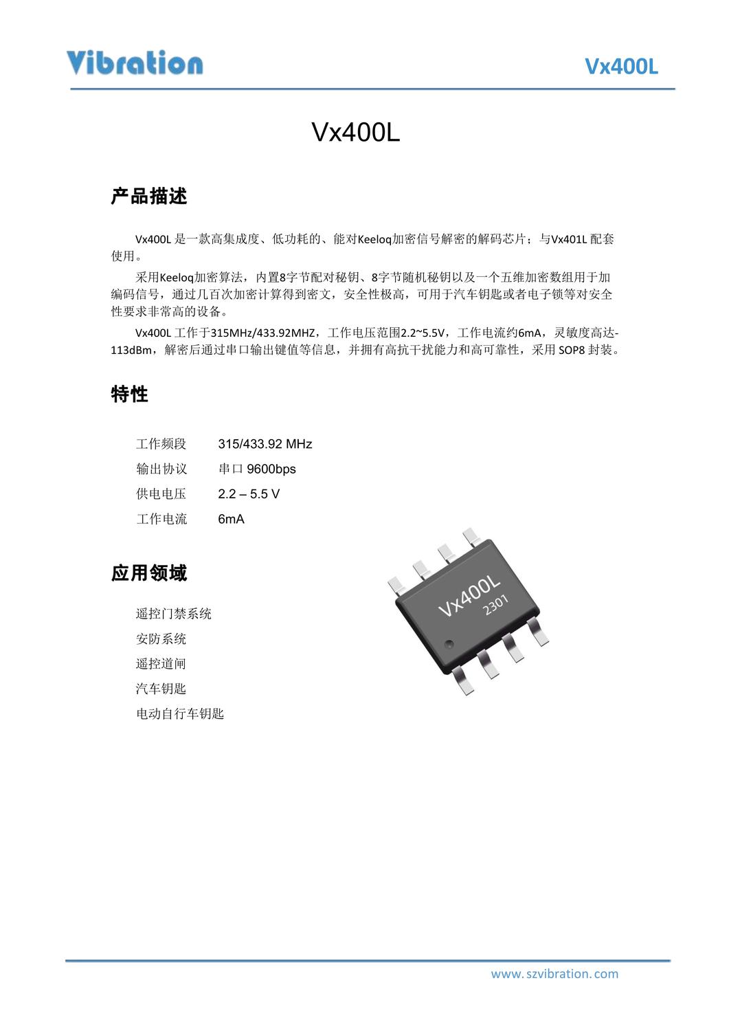 Vx400L 是一款高集成度、低功耗的、能對Keeloq加密信號解密的解碼芯片;與Vx401L 配套