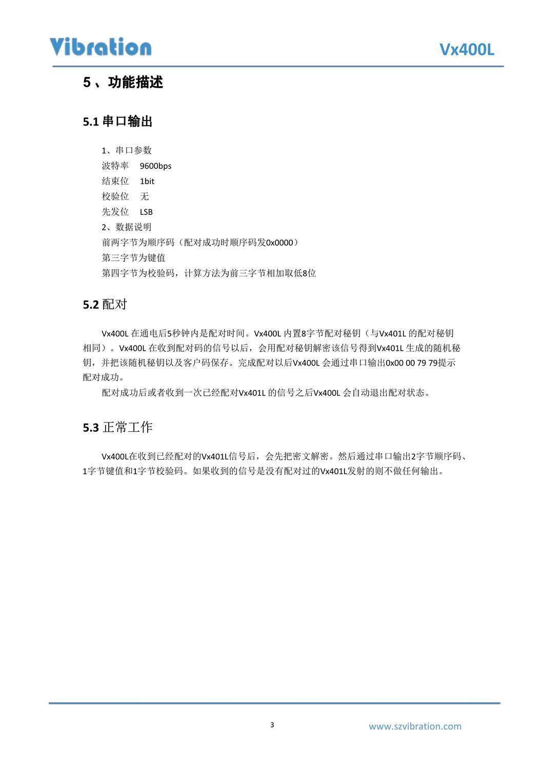 Vx400L 工作于315MHz/433.92MHZ,工作電壓范圍2.2~5.5V,工作電流約6mA,靈敏度高達- 113dBm,解密后通過串口輸出鍵值等信息,并擁有高抗干擾能力和高可靠性,采用 SOP8 封裝。